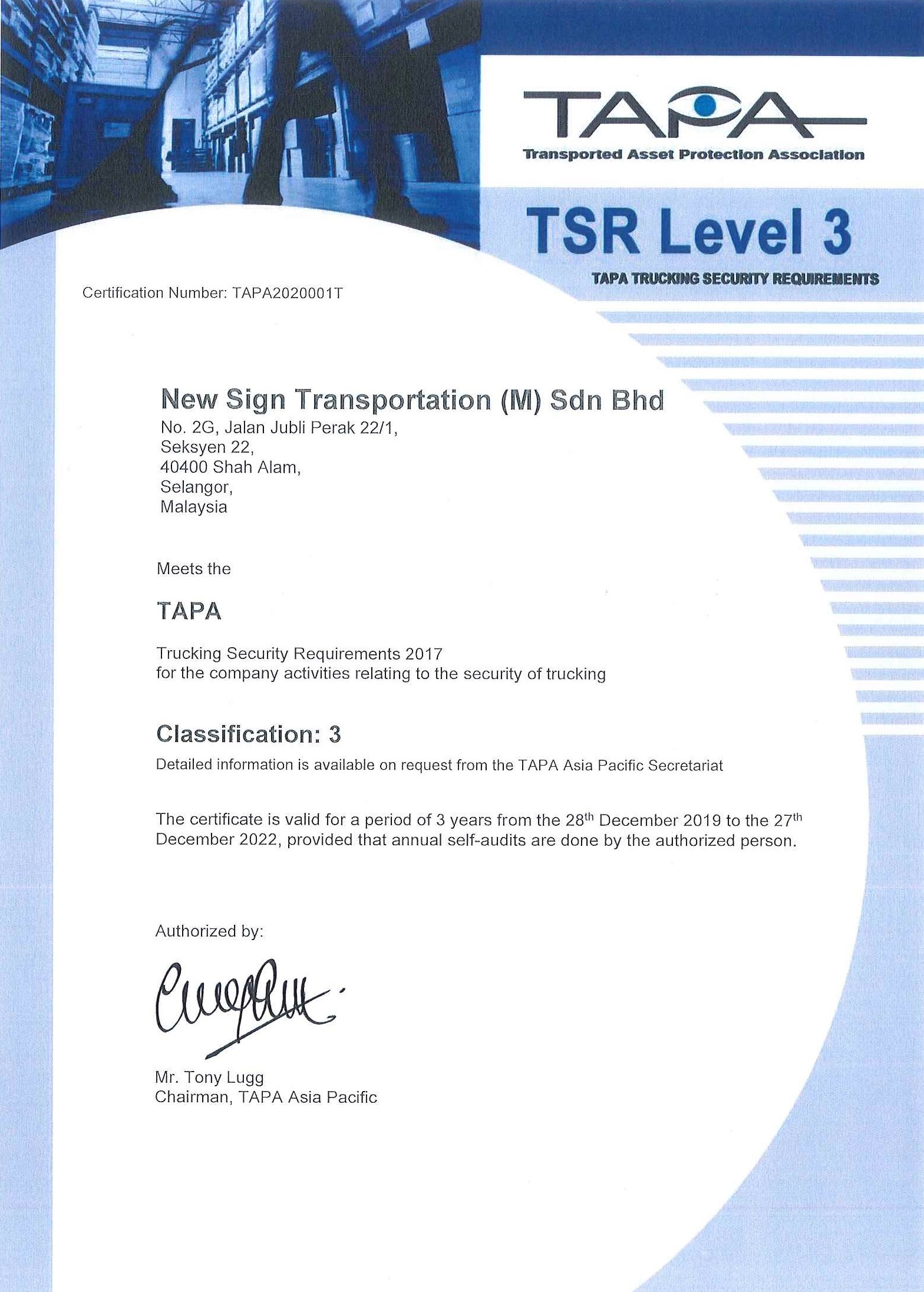 Company Certified with Transported Asset Protection Association (TAPA) Certification